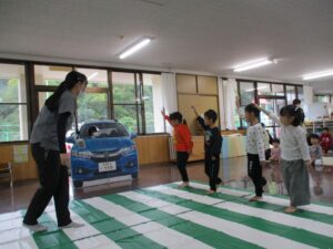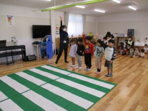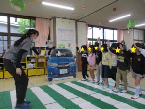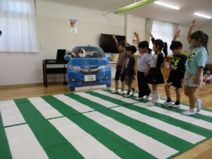 地域の方々と合同で交通安全教室を実施しました。横断歩道の渡り方では、園児に教えていただきながら一緒に渡ったり、交通安全体操も楽しく参加していただきました。