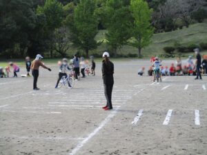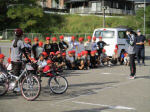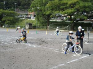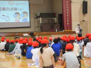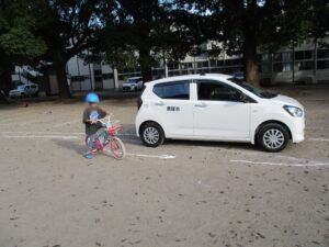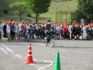 3年生を対象に初めての自転車教室を実施しました。初めに体育館でDVDを観た後に自転車の点検の仕方等を説明し、その後校庭にて自転車の乗り方をしました。