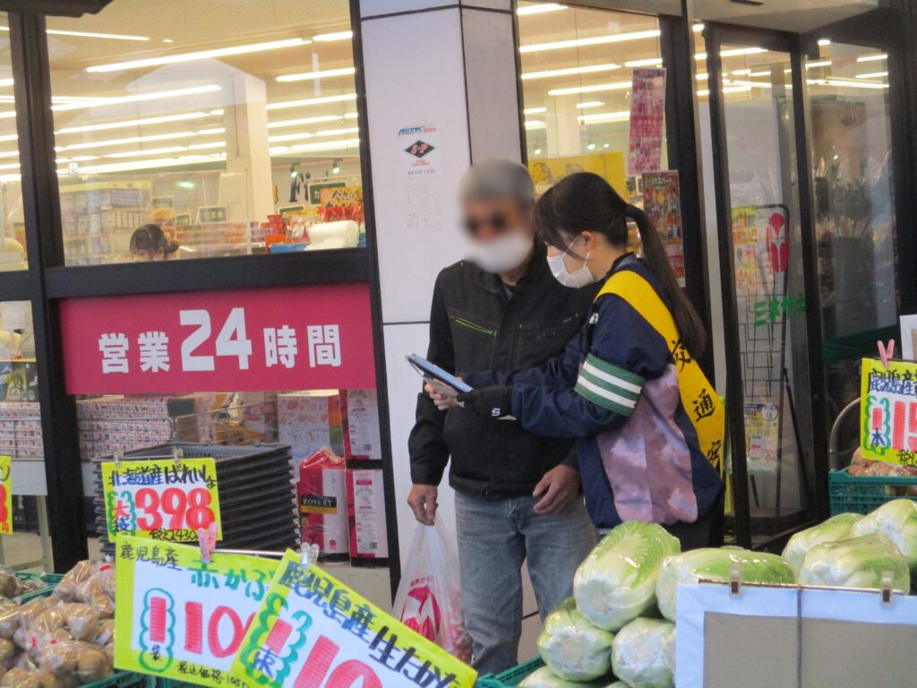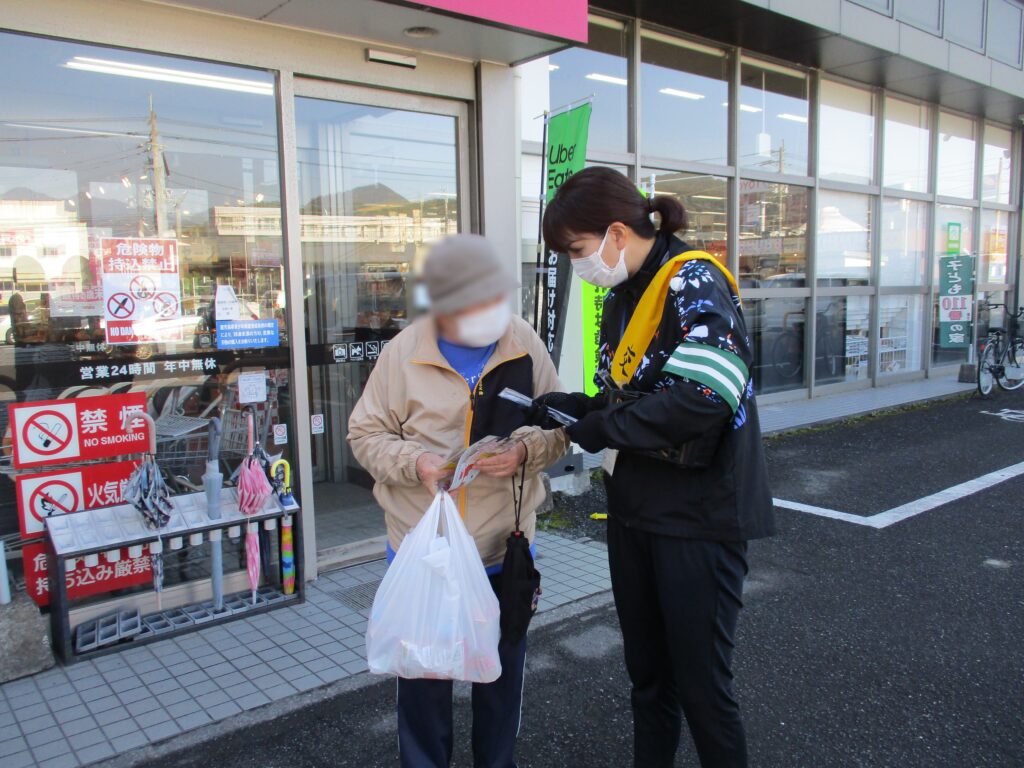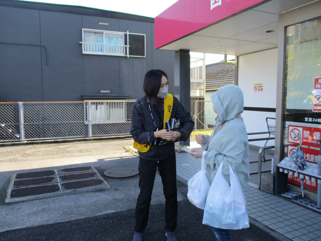 交通事故防止を呼びかけながら、安全運動に関するチラシや反射材・お茶などを二日間合わせて約200名分配布しました。